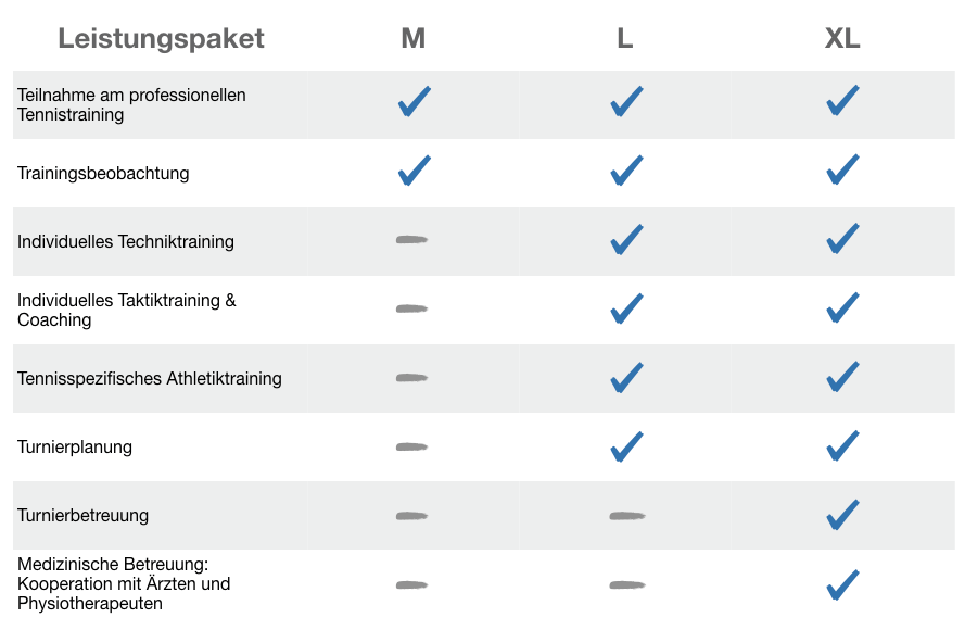 Um allen Spielern die passenden Trainingsbedingungen bieten zu können, gliedert sich unser Leistungsspektrum in drei Pakete mit unterschiedlichen Schwerpunkten und Umfängen. Für ein individuelles Angebot, treten Sie gerne mit uns in Kontakt.